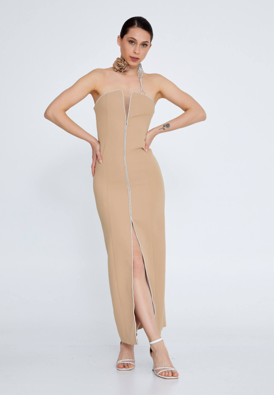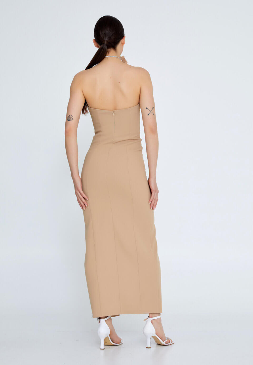 Cette robe longue beige sans bretelles allie simplicité et élégance.